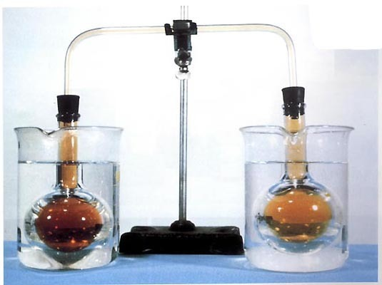 二氧化氮加压时很容易聚合。通常情况下与其二聚体形式--四氧化二氮 (无色抗磁性气体)混合存在,构成一种平衡态混合物:二氧化氮转化成四氧化二氮放热。升高温度,平衡向二氧化氮生成的方向移动;降低温度,平衡向四氧化二氮生成的方向移动。